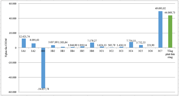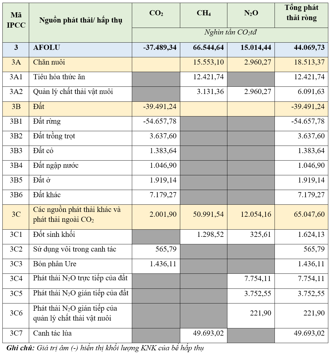 Tổng lượng phát thải/hấp thụ KNK trong lĩnh vực nông nghiệp, lâm nghiệp và sử dụng đất (AFOLU) năm 2016 là 44.069,73 nghìn tấn CO2tđ. Trong đó, hấp thụ lớn nhất từ đất rừng là -54.657,78 nghìn tấn CO2 và phát thải lớn nhất từ canh tác lúa là 49.693,02 nghìn tấn CO2tđ.